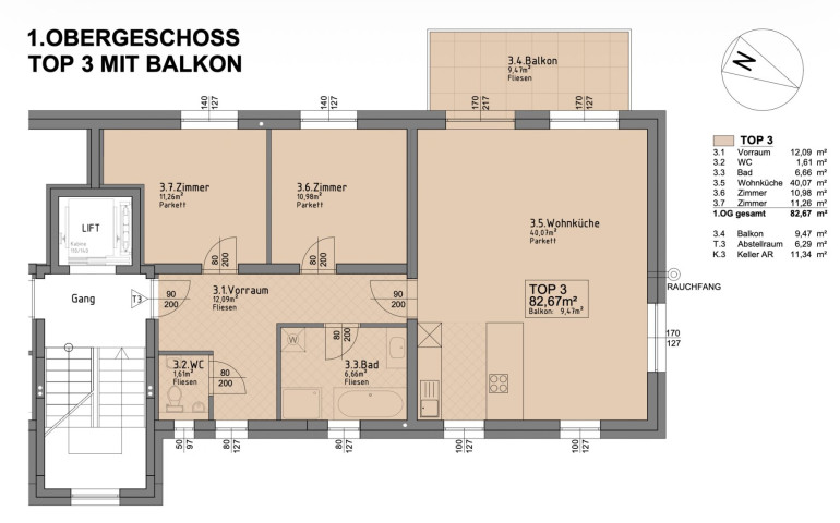 Über das Stiegenhaus oder bequem mit dem Lift gelangt man in das 1. Obergeschoß und somit in Top 3 mit einer Wohnfläche von rund 83 m². Vom großzügigen, zentralen Vorraum aus sind sämtliche Räume separat begehbar. Auf der Westseite befinden sich zwei Zimmer, während Bad und WC auf der Ostseite angeordnet sind. Das Herzstück der Wohnung bildet das großzügige und helle Wohnzimmer mit integrierter Küche und direktem Zugang zum angeschlossenen Balkon. Durch die durchdachte Raumaufteilung ergeben sich vielseitige Nutzungsmöglichkeiten für Wohnen, Arbeiten oder Beherbergung.