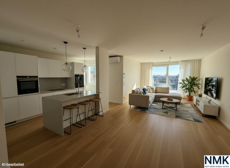 Die helle Wohnküche bildet das Herzstück der Wohnung und bietet direkten Zugang zu Balkon und Terrasse – ideale Freiflächen für entspannte Stunden im Freien.