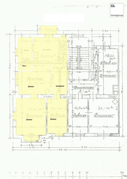 Raumaufteilung und Wohnnutzflächen (ca.): Vorzimmer 9,68 m², Zimmer#1 21,63 m², Zimmer#2 20,02 m², Zimmer#3 ("Kabinett" lt. Plan) 14 m², Esszimmer 13,32 m², Bad, Küche jew. ca. 4,5 m², WC 1,58 m², Abstellraum/Speis 1,53 m²; Balkon ca. 3 m². Der beiliegende Plan (Skizze) zeigt den Urzustand des 2. OG.