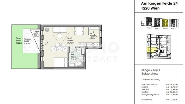 Wohnen Am Langen Felde 24 – fertiggestellt, hochwertig & gut angebundenIm 22. Wiener Gemeindebezirk, nahe der U1-Station Kagraner Platz, stehen bereits fertiggestellte Eigentumswohnungen zum Einzug bereit. Die Wohnhausanlage mit vier Stiegen und Tiefgarage überzeugt durch eine erstklassige, energieeffiziente Bauweise mit Fernwärme, Photovoltaikanlage und Fußbodenheizung – ideal für alle, die nachhaltig und zukunftssicher wohnen möchten.