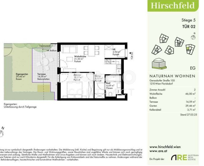 Naturnah und gut angebunden Hirschfeld ist ein beschauliches Viertel am Wiener Stadtrand. Die Metropole im Rücken verheißt jedem Nachhausekommen ein Naturerlebnis und Entspannung. Wer gerne mit den Wiener Linien unterwegs ist, nimmt am besten die Autobuslinie 32A ab Kollarzgasse bis zum U- und S-Bahn-Knotenpunkt Leopoldau. Von hier aus ermöglichen die U1 in Richtung Zentrum sowie die Schnellbahnlinien S1, S2 und S7 eine rasche Verbindung stadtein- und stadtauswärts. Alternativ verläuft die Straßenbahnlinie 31 entlang der Brünner Straße über Floridsdorf direkt bis Schottenring. Autofahrer profitieren von der nahegelegenen A22.