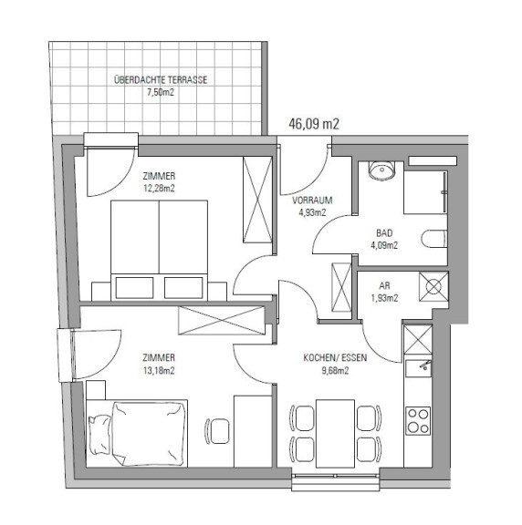 Die Wohnung teilt sich wie folgt auf: Vorraum, Küche, zwei getrennt begehbare Schlafzimmer, Bad/WC und eine ca. 8m² Terrasse