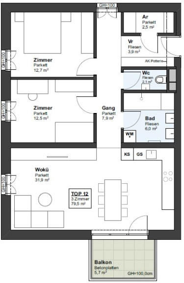 Die im 1. Obergeschoß geplante Wohnung Top 12 (Lift ist vorhanden) mit ca. 79,5 m² Wohnnutzfläche und einem Balkon mit ca. 5,7 m² verfügt über folgende Raumaufteilung: