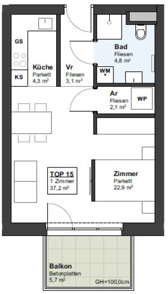 Die im Dachgeschoß geplante Wohnung Top 15 (Lift ist vorhanden) mit ca. 37,2 m² Wohnnutzfläche und einem Balkon mit ca. 5,7 m² verfügt über folgende Raumaufteilung:
