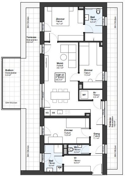 Die im Dachgeschoß geplante Wohnung Top 17 (Lift ist vorhanden) mit ca. 98,3 m² Wohnnutzfläche und einer Terrasse mit ca. 46,9 m² sowie einem Balkon mit ca. 9,8 m² verfügt über folgende Raumaufteilung:
