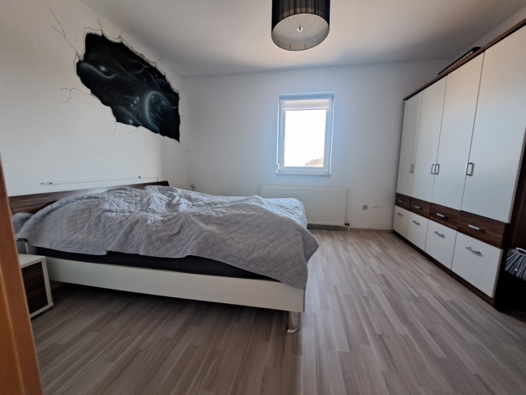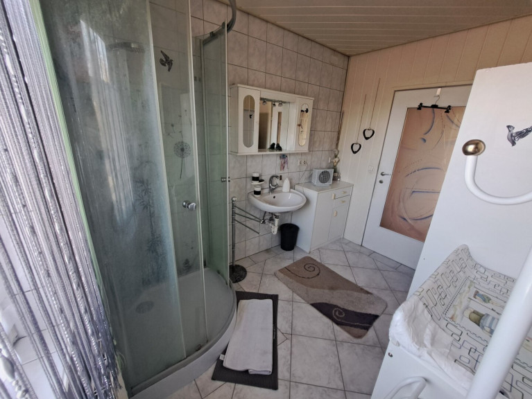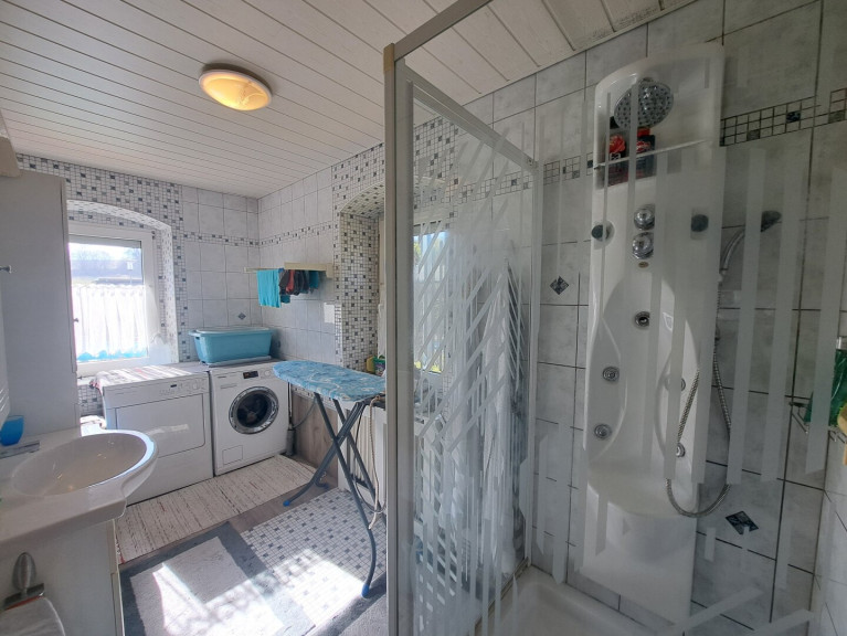 Das Haus verfügt über zwei separate Wohneinheiten, jeweils mit eigenem Bad und WC, was ideale Voraussetzungen für ein Mehrgenerationenwohnen oder eine vermietbare Einheit schafft. In den Wohnbereichen erwarten Sie moderne Fliesen und hochwertiger Laminatboden, die für ein angenehmes Wohngefühl sorgen.