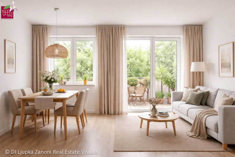 Der offen gestaltete Wohn- und Essbereich bildet das Herzstück der Wohnung und bietet direkten Zugang zum Balkon – ideal für entspannte Stunden im Freien.