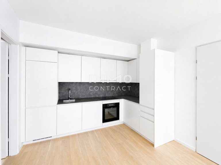 Der Grundriss ist modern, klar und effizient gestaltet: Beim Eintreten befindet sich rechter Hand die praktisch integrierte Küchenzeile mit Essbereich, die sich harmonisch in den Wohnraum einfügt. Auf der gegenüberliegenden Seite öffnet sich der helle Wohnbereich, der zum Entspannen und Verweilen einlädt. Durch einen stilvollen Raumteiler ist der Schlafbereich optisch vom Wohnraum getrennt und schafft eine angenehme Balance zwischen Offenheit und Privatsphäre. Das Badezimmer ist mit Dusche, Handwaschbecken, integriertem WC sowie Waschmaschinenanschluss ausgestattet. Großzügige Fensterflächen sorgen für viel Tageslicht und unterstreichen den freien Blick auf das Vienna International Center.