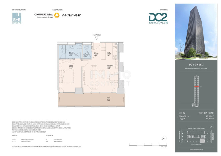 Der DC2 Tower zählt mit 52 Stockwerken und 314 hochwertigen Wohnungen ab dem 32. Obergeschoß zu den spektakulärsten Wohnprojekten des Landes. Die Wohnungsgrößen von ca. 30 bis 260 Quadratmetern bieten ein bewusst vielfältiges Angebot – von intelligent geplanten Einzimmerstudios über komfortable Familienwohnungen bis hin zu großzügigen Fünfzimmer-Maisonettewohnungen. Jede Einheit überzeugt durch durchdachte Grundrisse, hohe Wohnqualität und großzügige Fensterflächen, die den Blick nach außen inszenieren und die Stadt Teil des Wohnraums werden lassen. Loggien, Balkone und Freiräume erweitern den Wohnbereich und machen die beeindruckende Höhe unmittelbar erlebbar.