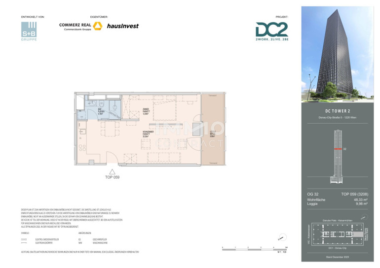 Der DC2 Tower zählt mit 52 Stockwerken und 314 hochwertigen Wohnungen ab dem 32. Obergeschoß zu den spektakulärsten Wohnprojekten des Landes. Die Wohnungsgrößen von ca. 30 bis 260 Quadratmetern bieten ein bewusst vielfältiges Angebot – von intelligent geplanten Einzimmerstudios über komfortable Familienwohnungen bis hin zu großzügigen Fünfzimmer-Maisonettewohnungen. Jede Einheit überzeugt durch durchdachte Grundrisse, hohe Wohnqualität und großzügige Fensterflächen, die den Blick nach außen inszenieren und die Stadt Teil des Wohnraums werden lassen. Loggien, Balkone und Freiräume erweitern den Wohnbereich und machen die beeindruckende Höhe unmittelbar erlebbar.