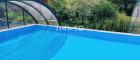 Der Swimmingpool im Garten ist ein Überlaufbecken mit einer Gegenstromanlage und hat eine gläserne Überdachung.