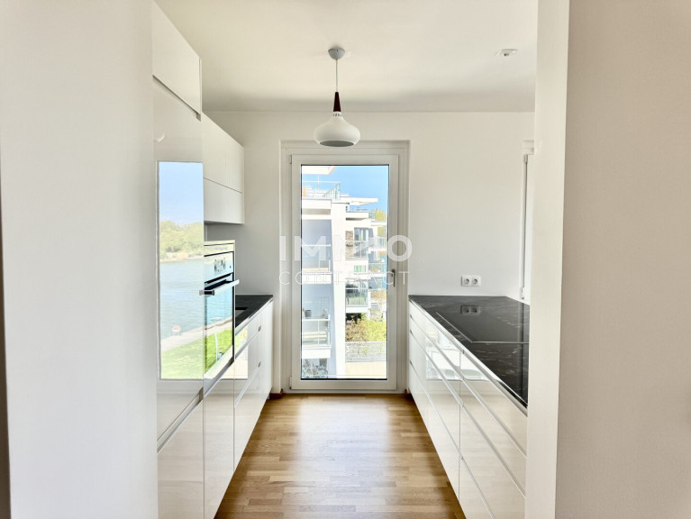 Die Wohnung befindet sich im zweiten Stock und verfügt über eine Wohnfläche von 118,4 m². Ein Keller mit ca. 14 m², ist ebenso inkludiert. Der Grundriss umfasst einen großzügigen Wohn- und Essbereich mit offener Küche und direktem Zugang zum Balkon, drei Schlafzimmer, zwei Badezimmer mit jeweils einem WC, ein Foyer und einen Abstellraum. Alle Schlafzimmer sind zentral zugänglich und separat begehbar. Der Balkon mit rund 14 m² Freifläche ist überdacht und blickt nach Osten auf den Kuchelauer Hafen und die Donau. Darüber hinaus sind alle Schlafzimmer mit bodentiefen verglasten französischen Balkonen ausgestattet.