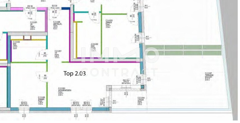Raumaufteilung Top 2.03: Vorraum, Wohn-Essbereich, Loggia, Schlafzimmer, Bad/WC + Kellerabteil.