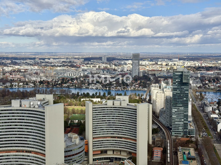 Dieses stilvolle Studio im DC2 Tower verbindet urbanen Komfort mit einem einzigartigen Ausblick auf das Vienna International Center (VIC). Die offene Aussicht auf das internationale Viertel Wiens verleiht der Wohnung ein kosmopolitisches Flair und macht sie zu einem besonderen Rückzugsort über der Stadt. Die ca. 10 m² große Loggia, die sich entlang der gesamten Wohnung erstreckt, erweitert den Wohnraum nach außen und wird zur privaten Aussichtsterrasse mit Blick auf eines der bedeutendsten internationalen Zentren Europas.
