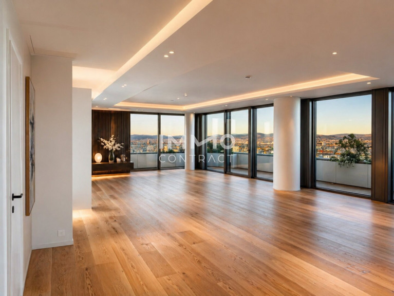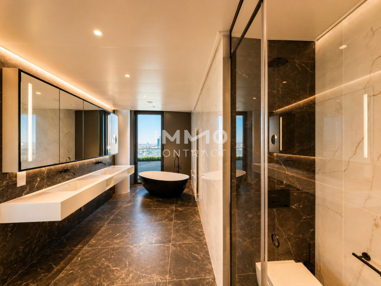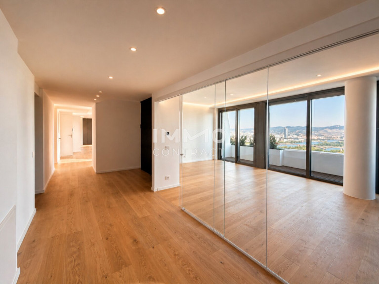 Diese luxuriöse 6-Zimmer-Wohnung bietet modernen Wohnkomfort auf höchstem Niveau. Besonders hervorzuheben ist die ca. 120 m² große Wohnküche, der perfekte Raum für kulinarische Erlebnisse und gesellige Zusammenkünfte. Große Fensterfronten bieten einen beeindruckenden Panoramablick auf die Innenstadt, die Donau und den Kahlenberg und sorgen für eine helle, lichtdurchflutete Atmosphäre. Der Masterbedroom ist ein echtes Highlight: Er verfügt über ein großzügiges, en-suite Bad mit einer freistehenden Badewanne, einer luxuriösen Walk-in-Dusche und einer privaten Sauna – ideal für entspannende Stunden in Ihrem eigenen Wellnessbereich. Zusätzlich bietet die Wohnung zwei weitere stilvoll ausgestattete Bäder, die alle mit exklusiven Armaturen und modernen Akzenten überzeugen. Die sechs Zimmer lassen sich individuell gestalten, sei es als Schlafzimmer, Arbeitszimmer oder Gästezimmer. Eine begehbare Garderobe sorgt für praktischen Stauraum und erhöht den Komfort der Wohnung.