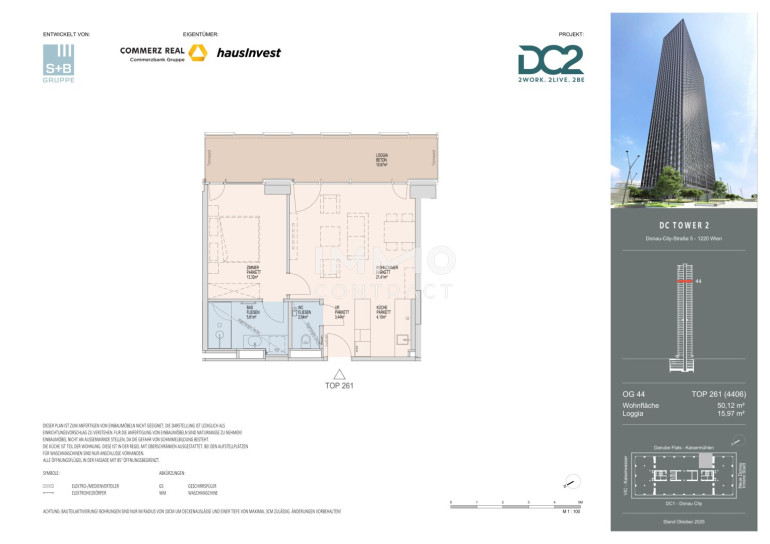 Der DC2 Tower zählt mit 52 Stockwerken und 314 hochwertigen Wohnungen ab dem 32. Obergeschoß zu den spektakulärsten Wohnprojekten des Landes. Die Wohnungsgrößen von ca. 30 bis 260 Quadratmetern bieten ein bewusst vielfältiges Angebot – von intelligent geplanten Einzimmerstudios über komfortable Familienwohnungen bis hin zu großzügigen Fünfzimmer-Maisonettewohnungen. Jede Einheit überzeugt durch durchdachte Grundrisse, hohe Wohnqualität und großzügige Fensterflächen, die den Blick nach außen inszenieren und die Stadt Teil des Wohnraums werden lassen. Loggien, Balkone und Freiräume erweitern den Wohnbereich und machen die beeindruckende Höhe unmittelbar erlebbar.