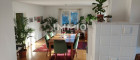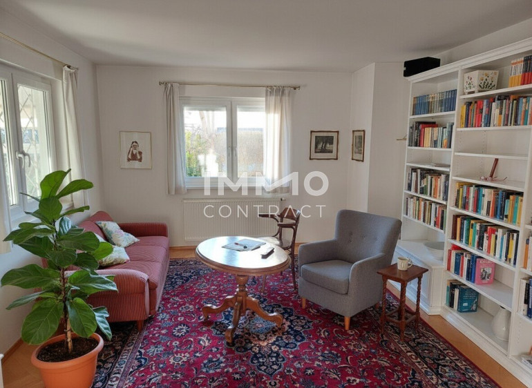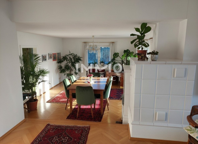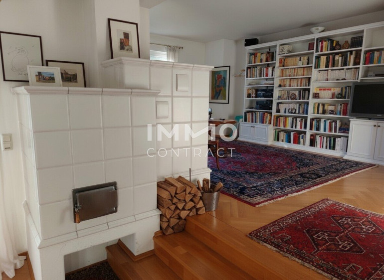 # sehr großzügiges Wohnzimmer (über insgesamt 45 m2 !!!) mit Bibliothek, gemütlichen und hochwertigen Kachelofen (2. optionales Heizsystem!!!), einem integrierten Essbereich, mit Zugang zur ca. 35 m2 # große verglaste West-Loggia, welche ganzjährig nutz- bzw. wohnbar ist