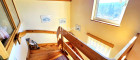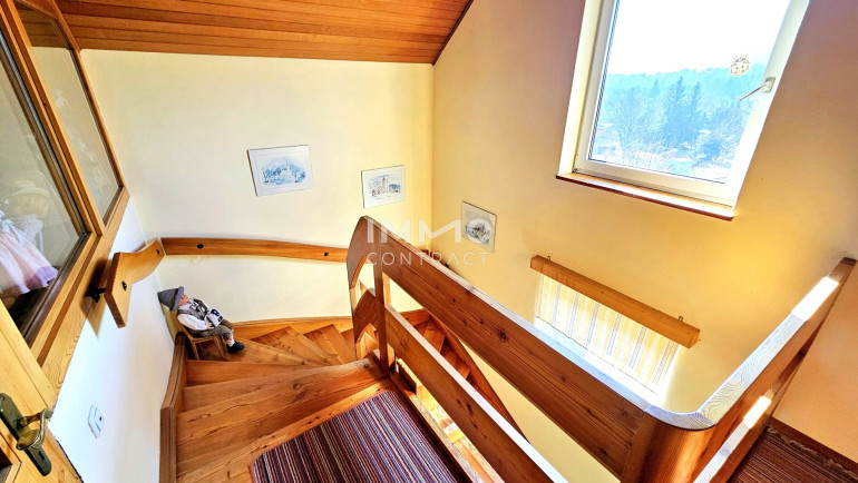 Das Obergeschoß erreichen Sie über eine wunderschöne Holztreppe. Dort finden Sie ein riesiges Wohnzimmer, 2 Schlafzimmer, Bad mit Dusche und ein separates WC vor.