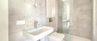 - Badezimmer mit Dusche, Waschbecken, Toilette und Waschmaschinenanschluss