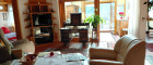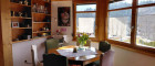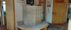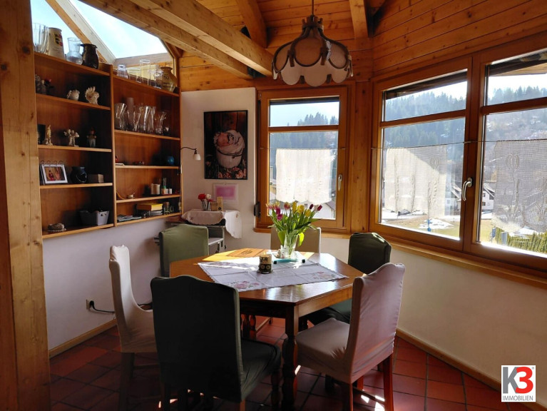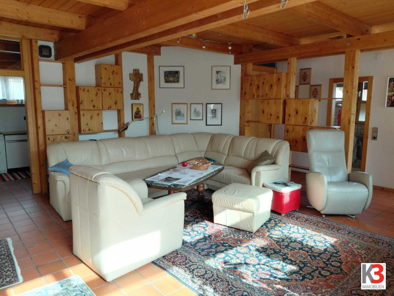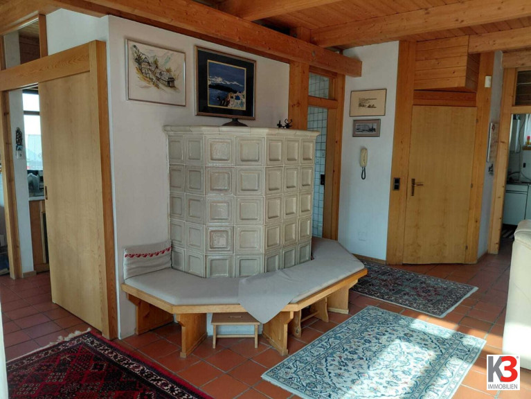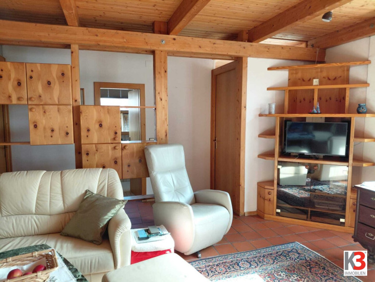 Das Wohnzimmer ist nach Süden ausgerichtet mit einem Wintergarten und einem kleinen Balkon, der auch zum Garten hinunter führt, im Wohnzimmer befindet sich auch der heimelige Kachelofen.