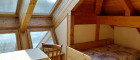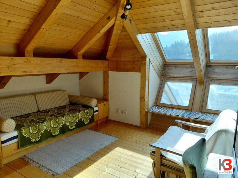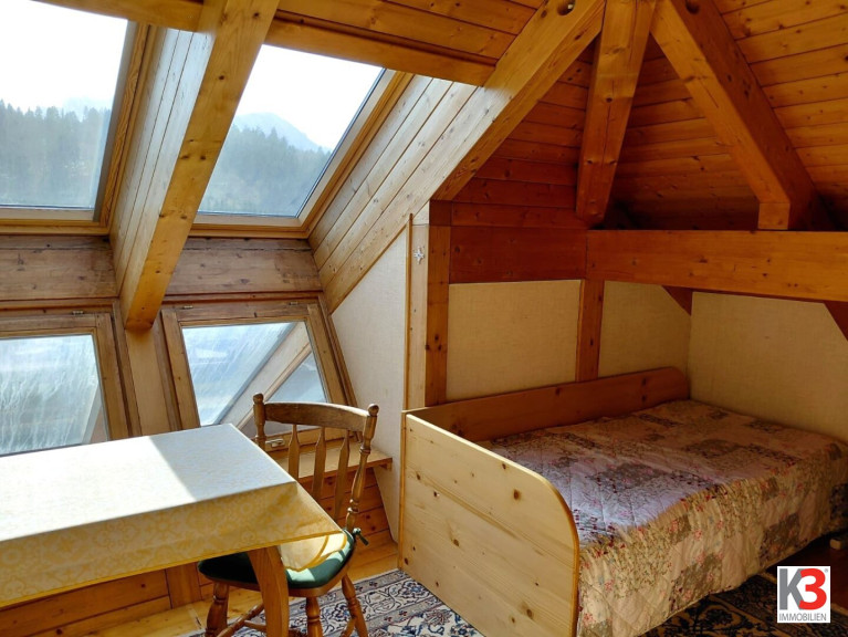 Im Obergeschoss ist das Herzstück des Hauses, der zentrale, offene Wohnbereich mit Zutritt zu allen anderen Räumen- Essbereich, Küche, Schlafzimmer, Kinderzimmer, Badezimmer, WC und Arbeitsraum. Der Ausblick ist auf die fernen Berge gerichtet und unverbaubar.