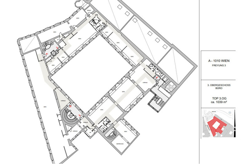 im Palais Harrach gelangt eine großzügige Bürofläche in repräsentativer Lage auf der Freyung im 1. Wiener Gemeindebezirk zur Vermietung. Die Liegenschaft befindet sich in unmittelbarer Nähe zum historischen Stadtkern und bietet eine ausgezeichnete Infrastruktur sowie eine sehr gute öffentliche Verkehrsanbindung. Die U-Bahn-Linien U1, U2 und U3 sind in wenigen Gehminuten erreichbar.