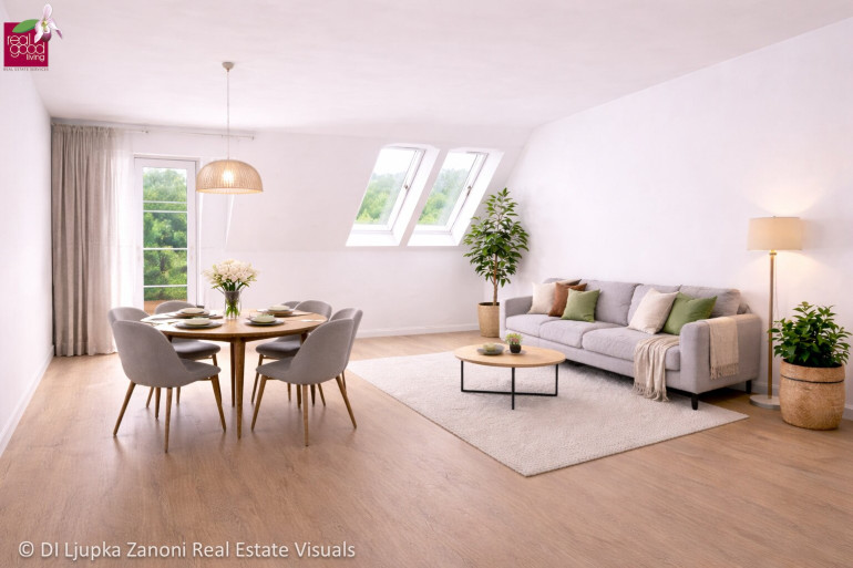 Der offen gestaltete Wohn- und Essbereich bildet das Herzstück der Wohnung und bietet direkten Zugang zum Balkon – ideal für entspannte Stunden im Freien. Zusätzlich sorgen schöne Dachfenster im Wohnbereich für viel natürliches Licht und eine besonders helle und freundliche Atmosphäre.