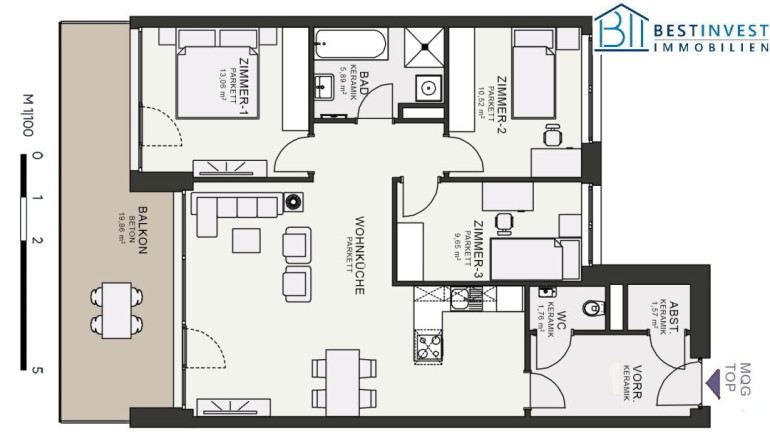 Parkett, Fernwärme, Fußbodenheizung, Einbauküche, Personenaufzug, Westbalkon, Badewanne, Dusche