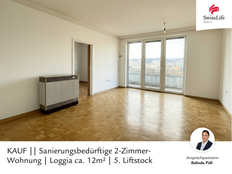 Sanierungsbedürftige 2-Zimmer-Wohnung | Loggia ca. 12m² | 5. Liftstock