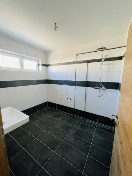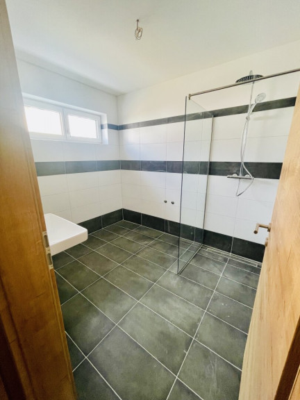 großzügiges Badezimmer mit Fenster und Dusche