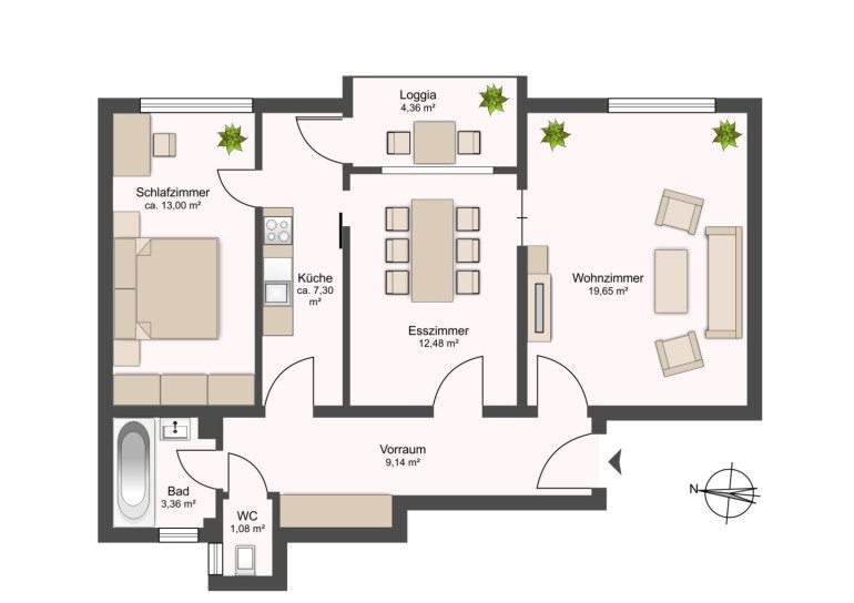- WG-Wohnung: In der Mitte eine Wohnküche & Essplatz als Gemeinschaftsraum und nördlich bzw. südlich davon jeweils ein privates Zimmer. Der Gang verbindet alle Wohnräume und das Badezimmer.