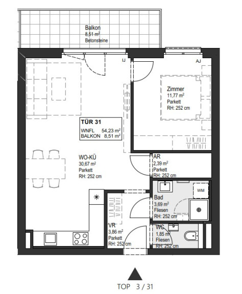 Parkett, Fliesen, Fußbodenheizung, Einbauküche, Westbalkon, Dusche