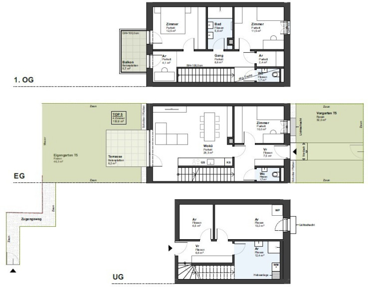 Die über ein Untergeschoß, Erdgeschoß und Obergschoß geplante Einheit Top 5 mit ca. 132,6 m² Wohnnutzfläche (inkl. Kellerflächen von ca. 38,7 m²), einer Terrasse von ca. 8,2 m² und einem Garten mit ca. 78,3 m² sowie einem Balkon mit ca. 5,7 m² verfügt über folgende Raumaufteilung: