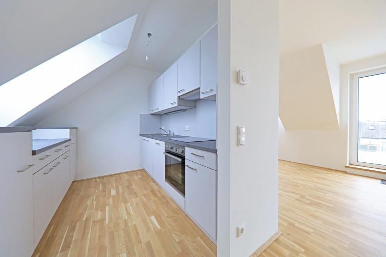 Über eine stilvolle gewendelte Holztreppe gelangen Sie in die obere Wohnebene in den zentralen Wohnbereich. Hier befindet sich auch die voll ausgestattete Einbauküche mit Geschirrspüler und Kühl-Gefrierkombination.