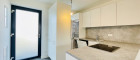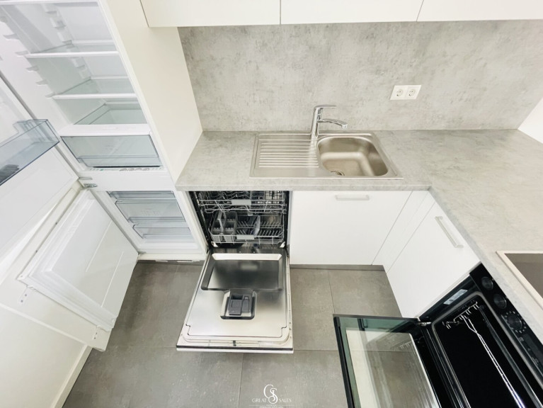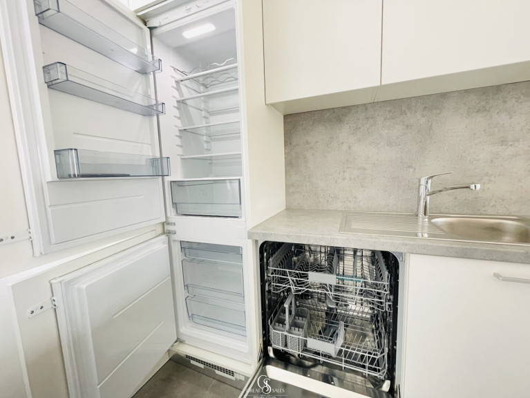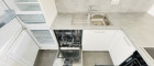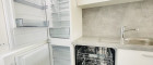 Die moderne Küchenzeile überzeugt mit hochwertigen Marken-Elektrogeräten und fügt sich harmonisch in den Wohnbereich ein.