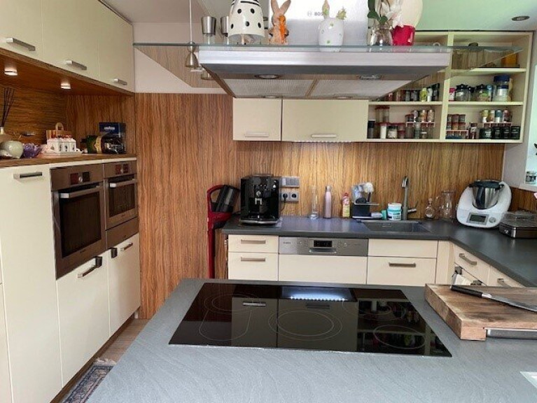 Das Herz des Hauses bildet der großzügige Wohnbereich im Erdgeschoss. Küche, Essplatz und Wohnen verschmelzen zu einer offenen, kommunikativen Zone – modernisiert im Jahr 2011 und perfekt geeignet für lange Abende mit Familie und Freunden. Große Öffnungen verbinden Innen und Außen und führen direkt in den Garten.
