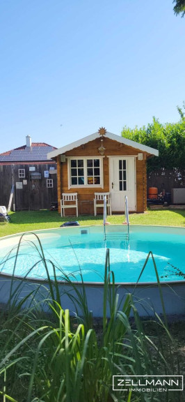 Besonders hervorzuheben ist die große Terrasse (ca. 30 m², davon 12 m² überdacht) mit offenem Kamin, die gemütliche Stunden im Freien verspricht. Der Garten mit Pool, Obstbäumen und einer neuen Gartenhütte lädt zum Entspannen ein.