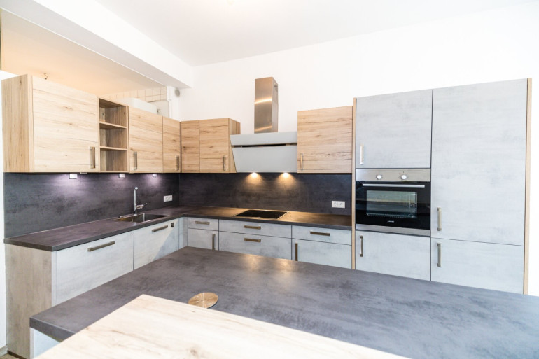 Die voll ausgestattete Einbauküche mit Kochinsel ist das Herzstück der Wohnung – ausgestattet mit Kühlschrank, Gefrierfach, Ceranfeld, Backofen, Dunstabzug, Spüle und Geschirrspüler in elegantem Hell-/Dunkelgrau.