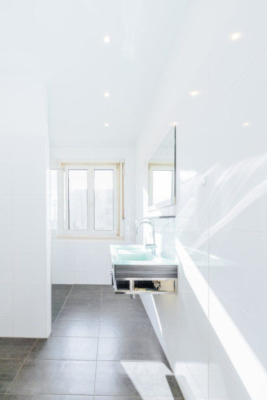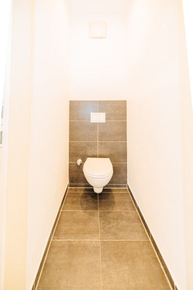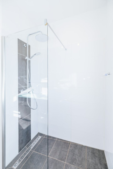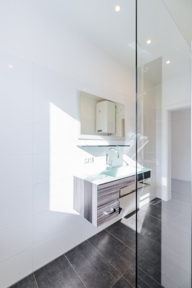Praktisch und komfortabel mit Fenster, Waschbecken, bodengleicher Dusche und Waschmaschinenanschluss - zusätzlich ein extra begehbares WC. - Moderner Laminatboden & große Fenster