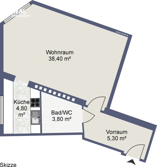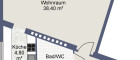 Sie gliedert sich in einen Vorraum, süd-/ ostseitiges Wohn-/ Schlafzimmer, moderne Küche mit allen Geräten, Badezimmer mit Toilette.