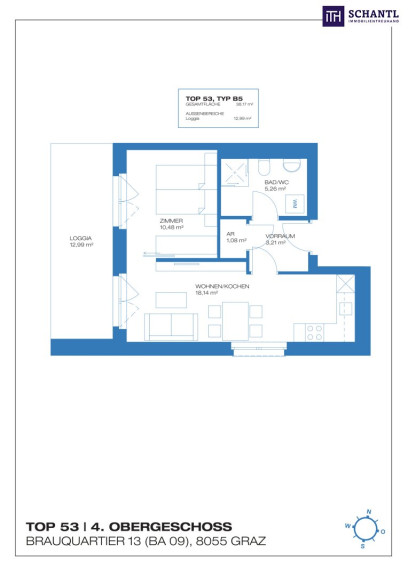 Diese charmante Wohnung im 4. Obergeschoss überzeugt mit einer idealen Wohnfläche von 38,17m², perfekt für Singles oder Paare. Genießen Sie die Abendsonne dank West-Ausrichtung und einen lichtdurchfluteten Wohnbereich mit integrierter, moderner Küche – ideal für Hobbyköche. Das geräumige Schlafzimmer und das hochwertige Badezimmer mit Dusche sorgen für Komfort und Entspannung. Besonderes Highlights, die 12,99m² große Loggia lädt zu erholsamen Stunden ein. Zusätzlich profitieren Sie von einem praktischen Kellerabteil, effizienter Nahwärme-Heizung und niedrigen Betriebskosten.