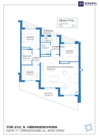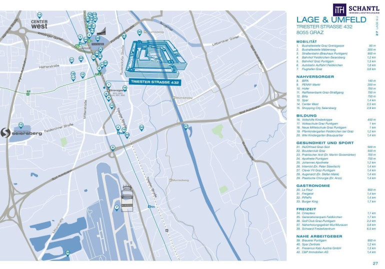 Dieses Projekt zeichnet sich durch eine außergewöhnlich gute Infrastruktur aus. Die Anbindung an das öffentliche Verkehrsnetz ist direkt vor der Haustüre gegeben (Bushaltestelle Graz Grenzgasse: 80m). Nahversorger wie Bipa, Penny und Hofer befinden sich direkt um die Ecke. Weitere Einrichtungen des täglichen Bedarfs befinden sich in unmittelbarer Distanz: Center West, Shopping City Seiersberg, zahlreiche Gastronomiebetriebe sowie Gesundheits- und Bildungseinrichtungen. Der 17. Grazer Bezirk stellt derzeit eines der größten Grazer Stadtentwicklungsgebiete dar. Perfekter Standort ist gegeben - Einerseits erreichen Sie öffentlich in nur 20 Minuten das Zentrum von Graz (Jakominiplatz) und anderseits sind kurze Wege zur Autobahn A2 und A9 (4 Fahrminuten) gegeben.