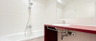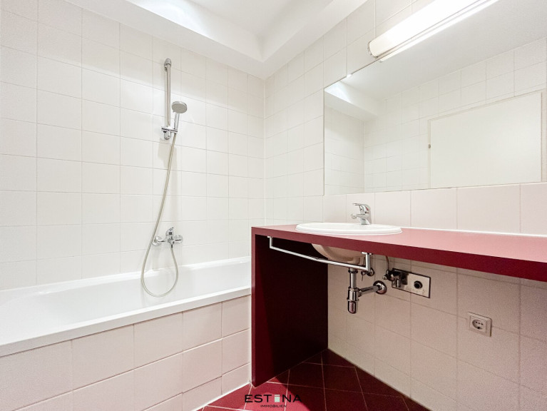 - Badezimmer mit Badewanne, Waschbecken und Waschmaschinenanschluss