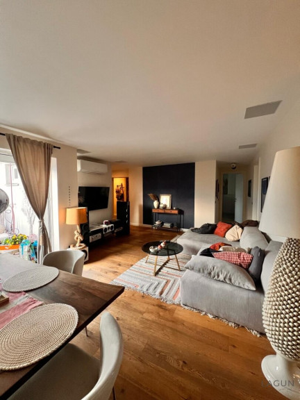 Der großzügige Wohnbereich mit moderner Einbauküche bildet das Zentrum der Wohnung. Hochwertige Parkettböden sowie eine Fußbodenheizung sorgen für ein angenehmes Wohnklima.