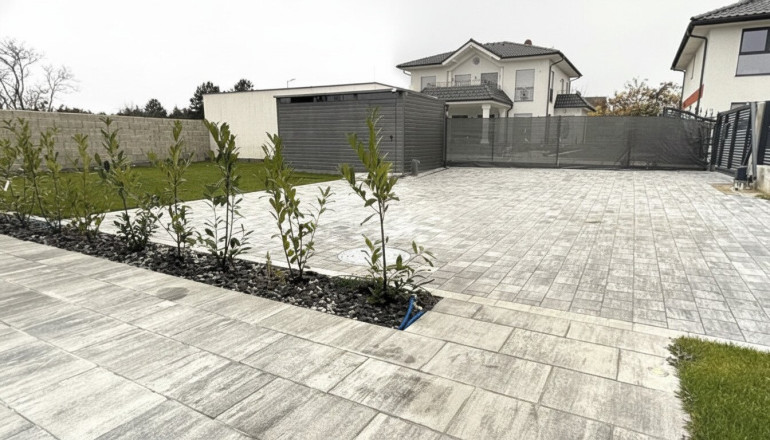 Der weitläufige Vorplatz bietet zudem komfortable Parkmöglichkeiten für mehrere Fahrzeuge. Durch die großzügige Zufahrt und die praktische Aufteilung ist das Ein- und Ausparken besonders bequem, auch für Gäste. So verbinden sich funktionale Vorteile mit einem einladenden Erscheinungsbild des gesamten Grundstücks.