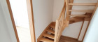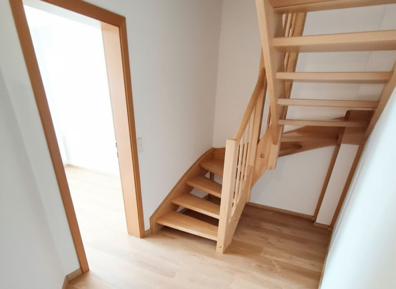 Über eine schöne Holztreppe erreichen Sie das Obergeschoss. Dort befinden sich zwei weitere Zimmer, ein kleiner Vorraum sowie ein Badezimmer mit Badewanne – ideal, um nach einem langen Arbeitstag zu entspannen.