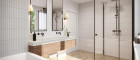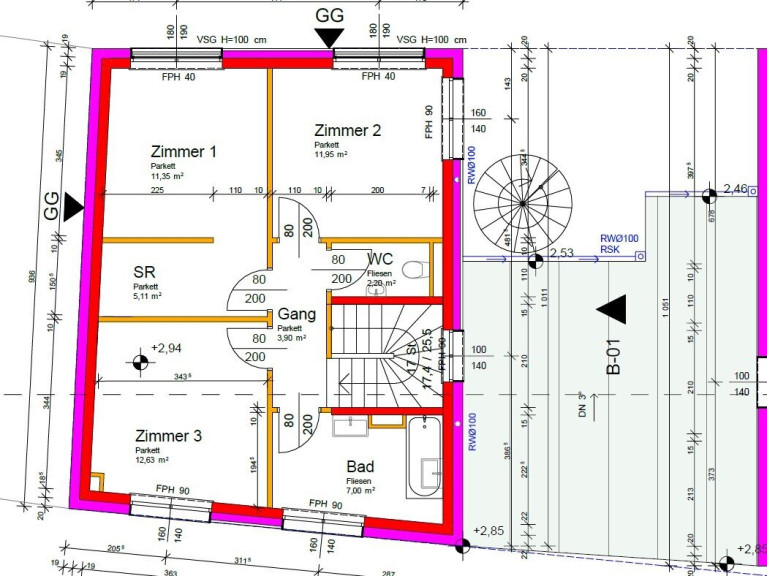 Im Obergeschoss erwarten Sie drei geräumige und lichtdurchflutete Schlafzimmer mit ca. 11 m² bis 13 m². Eines der Schlafzimmer verfügt über einen eigenen ca. 5 m² großen Schrankraum. Das elegante Badezimmer ist mit Badewanne, bodengleicher Dusche und Doppelwaschbecken ausgestattet, ein separates WC ergänzt den Komfort.