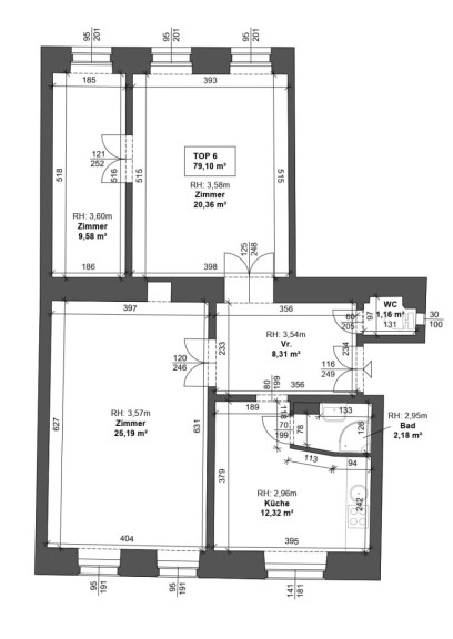 Vom zentralen Eingangsbereich mit Vorraum befindet sich auf der linken Seite die Küche sowie ein Badezimmer mit Dusche, vom Vorraum rechts, das separate WC. Geradeaus durch den Vorraum befindet sich das Wohn/-esszimmer, rechts vom Vorzimmer ein weiteres Zimmer, gefolgt vom nachfolgenden Kabinett, welches als Schlafzimmer oder Kinderzimmer genutzt werden kann. Der großzügige Wohnraum bietet ausreichend Platz für eine gemütlche Sofalandschaft sowie Essbereich.