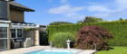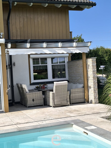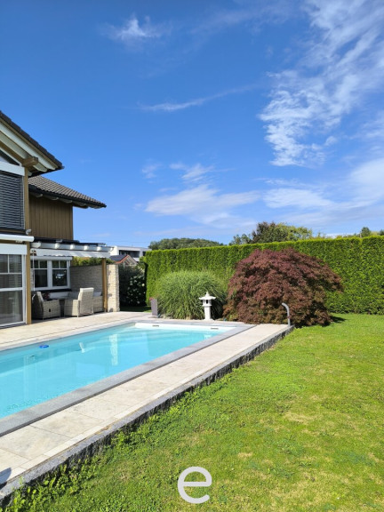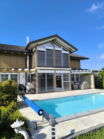 Der solarbetriebene Pool (7 × 3,5 m) mit im Gerätehaus untergebrachter Technik fügt sich harmonisch in den Garten ein und bietet entspannten Badespaß auf höchstem Niveau. Ein Pool- und ein Rasenroboter sind bereits inkludiert und sorgen für glasklares Wasser und für gepflegte Grünflächen ohne Aufwand.