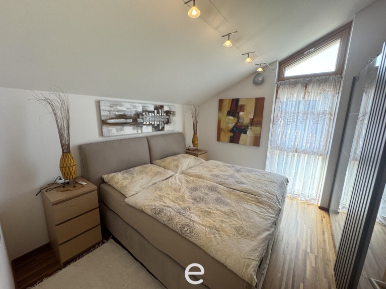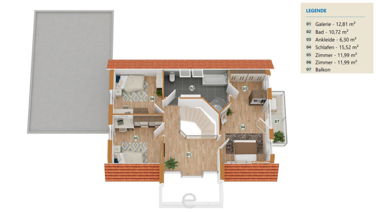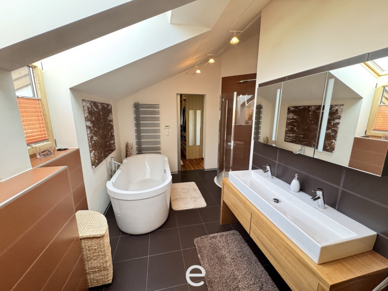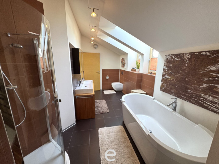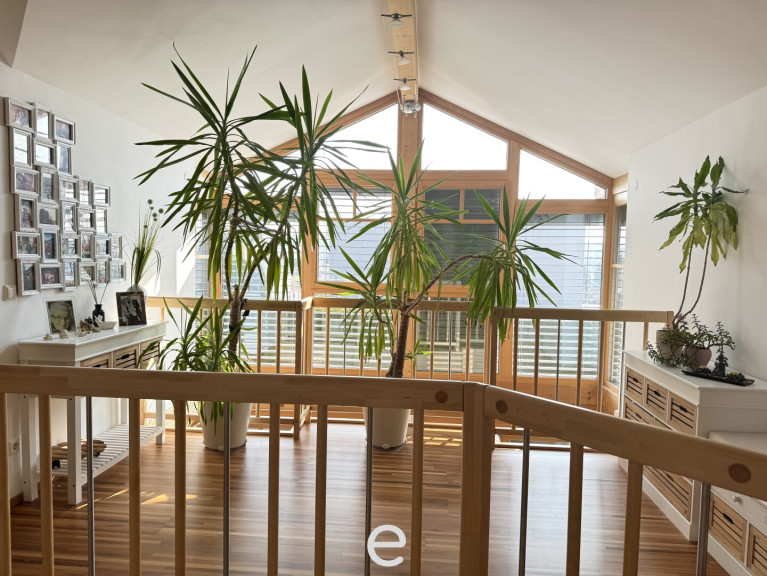 Die offen gestaltete Galerie mit traumhaftem Blick in den Wohnbereich schafft ein beeindruckendes Gefühl von Weite und lässt die Räume lichtdurchflutet und besonders exklusiv wirken. Das Elternschlafzimmer verfügt über direkten Zugang zum Balkon, einen separaten Ankleideraum sowie ein exklusives, großzügiges Badezimmer mit freistehender Badewanne, Dusche, Doppelwaschbecken und WC.